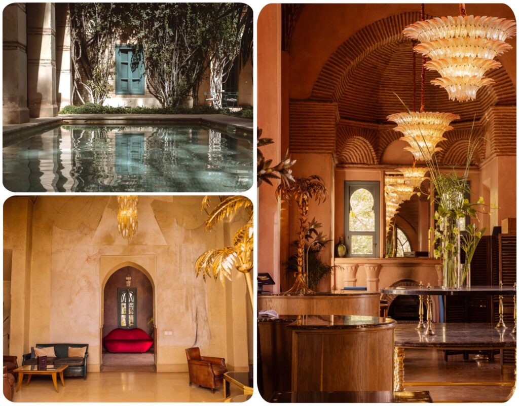 Portes rapportées d’Inde, grandes hauteurs sous plafond – « le luxe réside dans les espaces perdus », résume le directeur Mohamed Hejjaj –, marbres qui se marient avec l’artisanat marocain, immenses luminaires en verre de Murano dans la salle de restaurant. Le parc abrite un potager de 7 500 m², des chèvres qui fournissent le lait, un couple de paons, des citronniers, des oliviers, même un arbre hybride, pamplemousse croisé avec orange navel. Au fond, une longue piscine chauffée en hiver traverse la verdure.